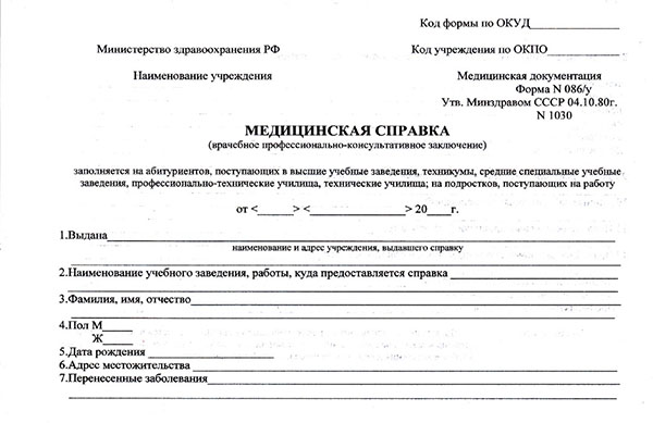 Справка образца 086/у необходима к получению в ситуации, когда молодой человек после окончания школы поступает в университет или колледж. Абитуриент обязан подтвердить нормальное состояние здоровья посредством этого документа, чтобы у него не возникло никаких проблем и ограничений на новом месте учебы. Действительной такая справка остается максимум полгода после оформления.
