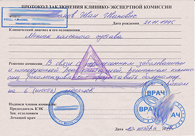 Данное заключение может быть выписано любому человеку, если на то есть веские основания: серьезная болезнь или травма, ограничения на определенную деятельность (например, занятия физкультурой) и так далее. Врач заполняет в бланке информацию о диагнозе, специфике лечения, необходимых мерах предосторожности и прочие сведения.